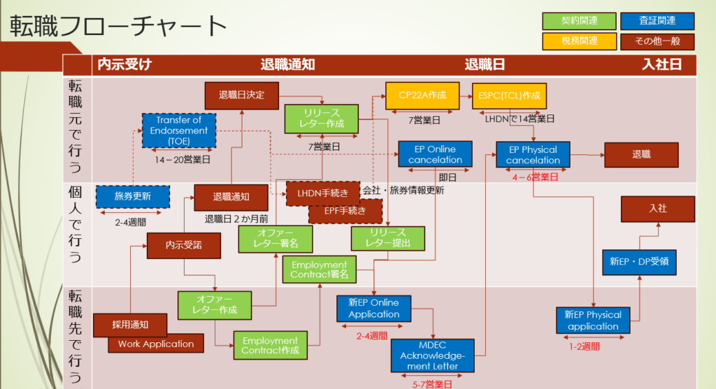 マレーシア国内での転職においては、各種手続きが相互に依存しているため、時間設計が全体の成否を左右する重要なポイントとなります。特にEP申請や税務手続きは想定以上に時間を要するケースも多く、余裕を持った計画が不可欠です。
